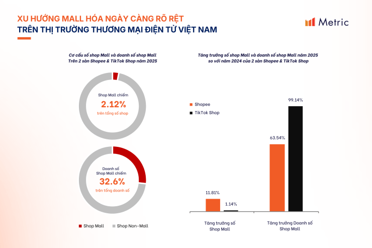 - Con số biết nói: Trên Shopee và TikTok Shop, nhóm Shop Mall chỉ chiếm vỏn vẹn 2,12% tổng số lượng gian hàng, nhưng lại “càn quét” tới 32,6% tổng doanh số.