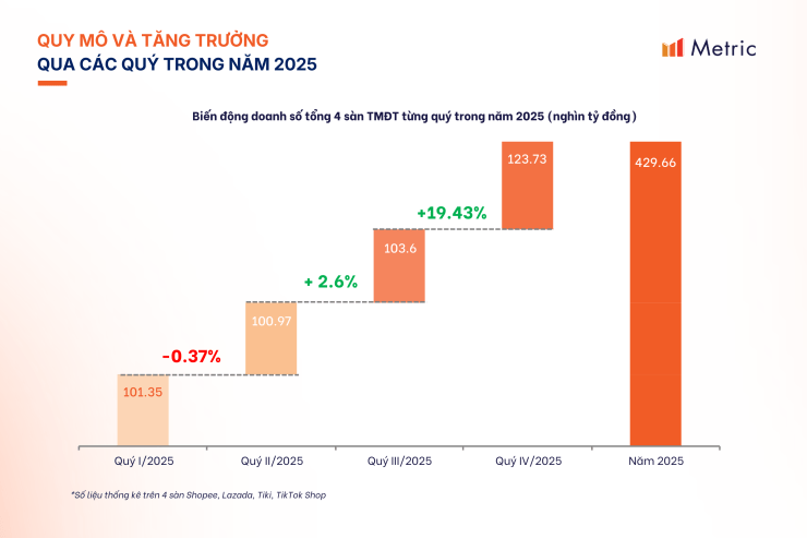 Năm 2025 ghi nhận sự vươn lên mạnh mẽ của kênh bán lẻ trực tuyến. Tổng doanh số trên 4 sàn (Shopee, TikTok Shop, Lazada, Tiki) đạt 429,7 nghìn tỷ đồng, tăng vọt 34,75% so với năm 2024. Đỉnh điểm là Quý 4/2025 với 123,7 nghìn tỷ đồng doanh thu, nhờ chuỗi Mega Sale dồn dập cuối năm.