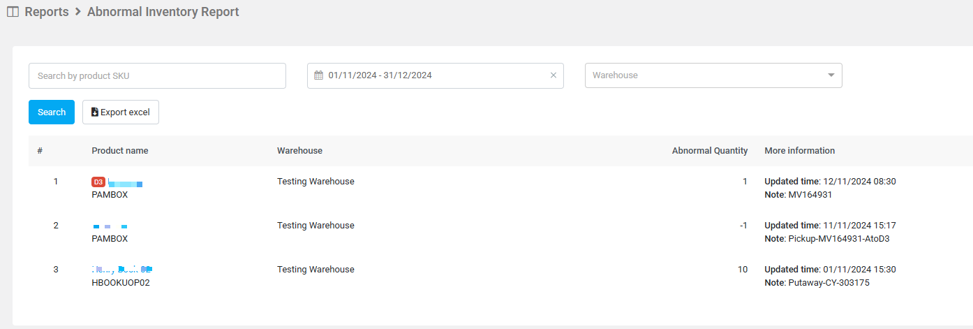 - The system will display a list of SKUs with abnormal inventory adjustments, including details such as:. Product name, product condition, SKU, warehouse, quantity changed, adjustment reason.