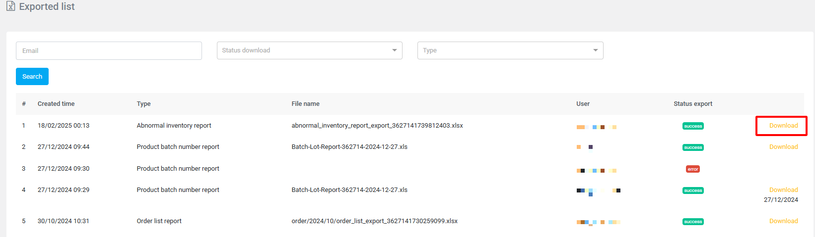 Guideline to export an excel file: click “Export excel”, then click “My export”, and click “Download”