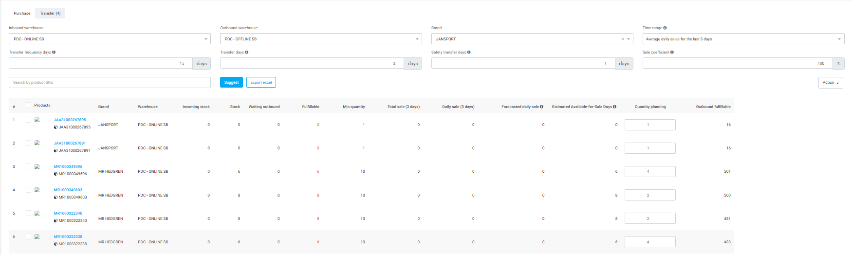 - Inventory transfer planning: The system will be based on the seller’s sales history and sales plan to make suggestions on the amount of inventory to be rotated between warehouses, this helps the seller balance the inventory of each warehouse, thereby helping the warehouse to have enough goods for sale, avoiding excess or overstocking into a fixed warehouse.
