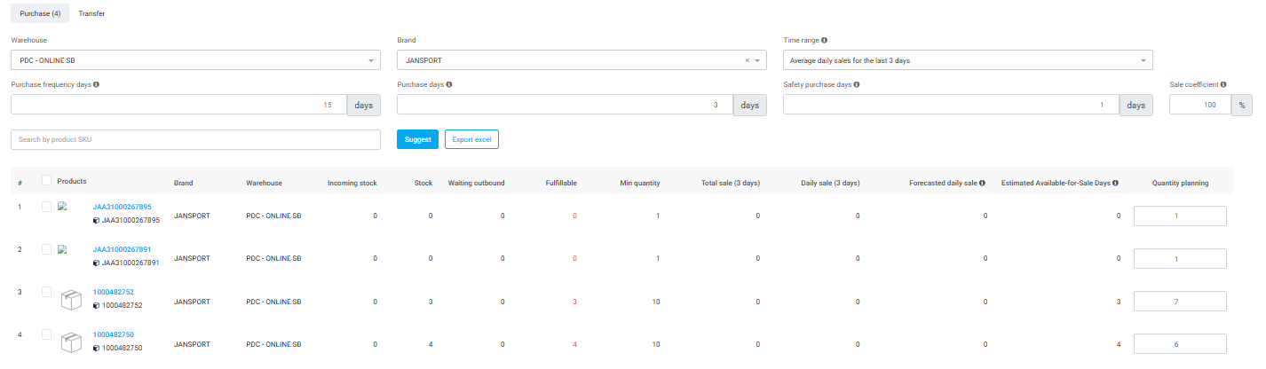 Quantity Planning = Min quantity – Fulfillable + (Purchase Frequency days + Purchase days + Safety Purchase days)*Forecasted Daily sales