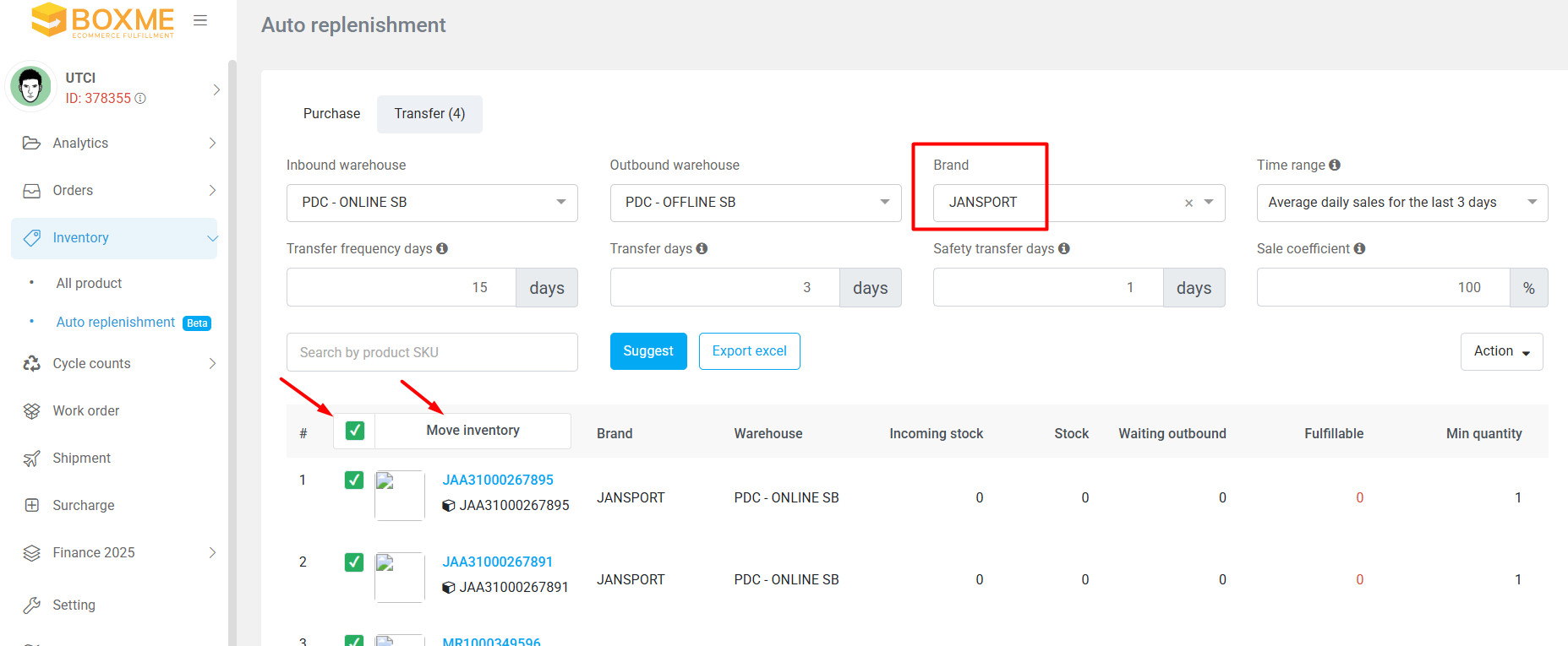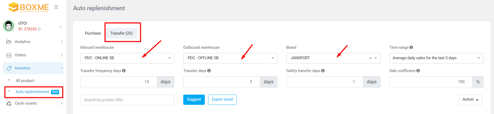 The seller can access the Boxme OMS system > Inventory > Auto replenishment > Transfer. At this interface, the seller can choose which warehouse the goods will need to be moved to, which warehouse to move from and which brand of products the seller wants to circulate.