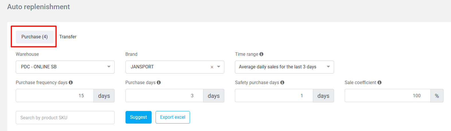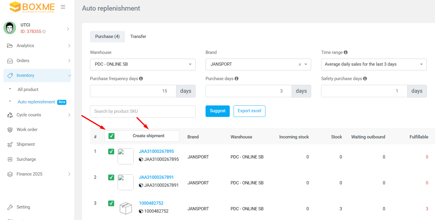 The seller can access the Boxme OMS system > Inventory > Auto replenishment > Purchase. At this interface, the seller can choose the warehouse and brand of products that the seller wants to import more goods.