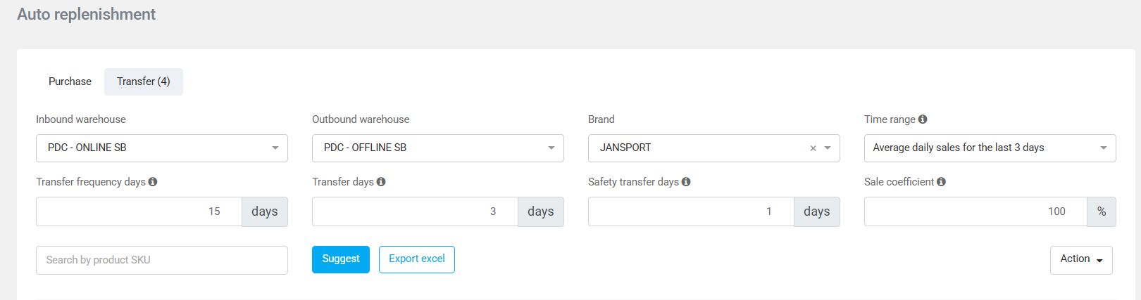 - Transfer Days: Estimated time from creating an order to move goods from warehouse A to receiving goods at warehouse B. Example: 3 days.