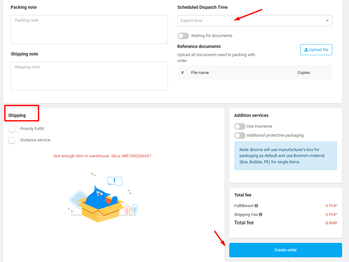 After checking the relevant information, the seller selects Boxme’s shipping service or selects the seller’s own shipping service and clicks the “create order” button to create a goods rotation order.