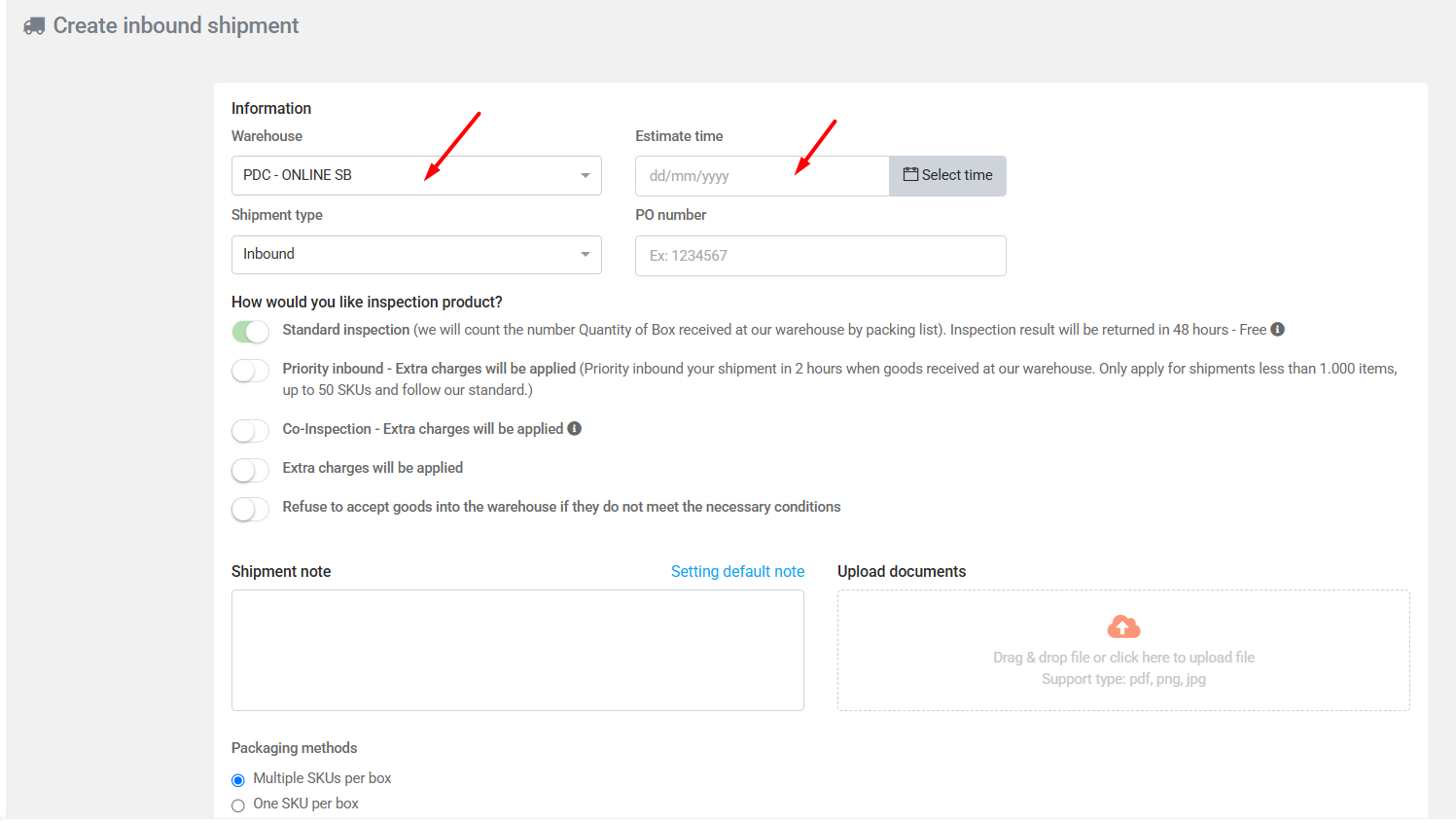 The system will display a screen that creates a warehouse request for the seller to check some information such as warehouse, product, quantity of each product and add some other information such as estimated delivery time, related service charge options…