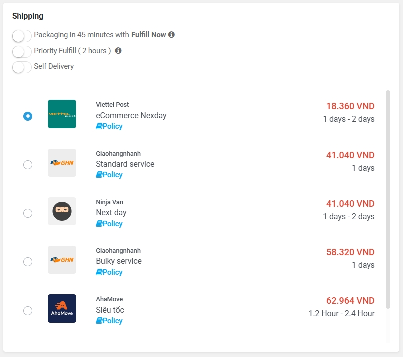 When creating an order on the system, sellers can choose shipping services that match the requirements, delivery time and cost. If the seller does not know which service to choose for the order, please contact account management (AM) for more detailed advice before choosing a shipping service.