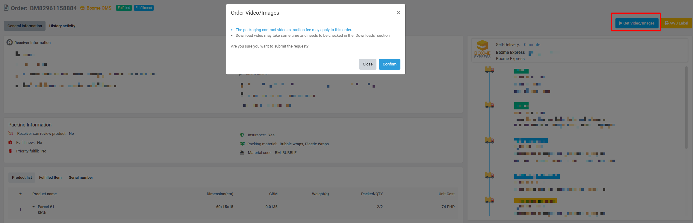 Để gửi yêu cầu trích xuất camera đóng gói, khách hàng có thể đăng nhập vào tài khoản OMS, tìm đến đơn hàng mà khách hàng muốn trích xuất. Hệ thống sẽ yêu cầu xác nhận chi phí và thực hiện việc tải video.