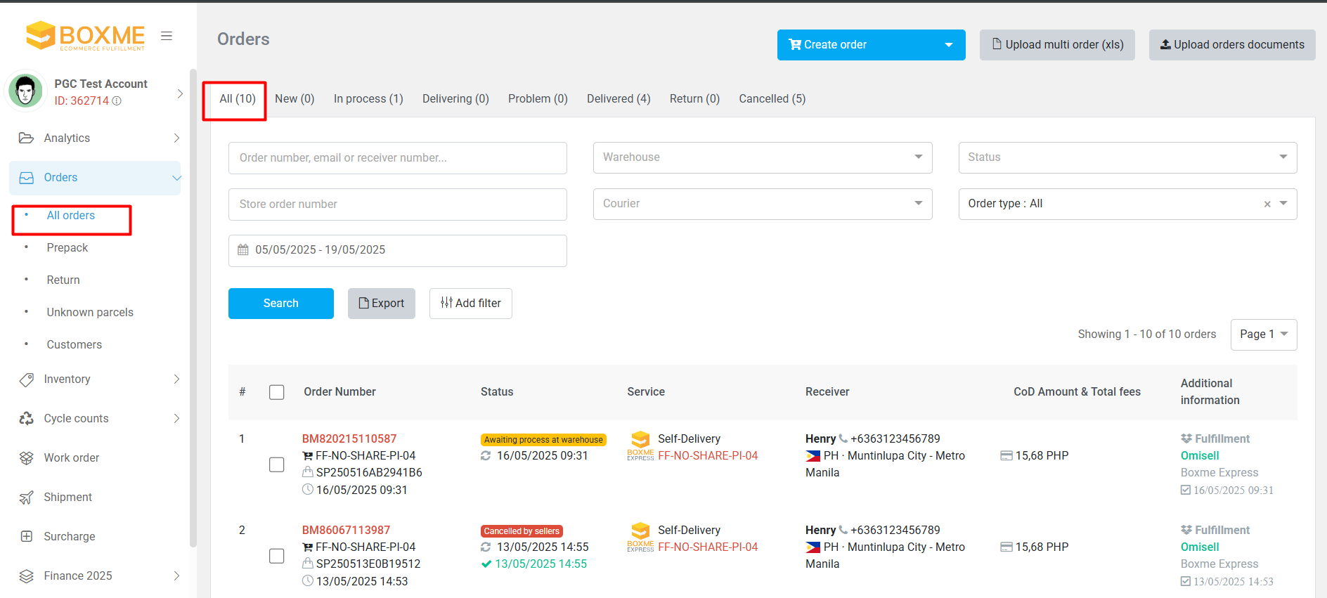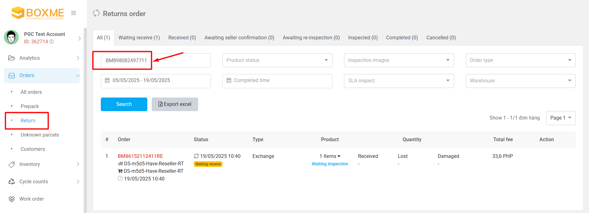 Based on the origin order code, the customer can search it, then the Boxme system will show all relevant return order code (created by Marketplace or by Boxme system) so that the customer can track/follow the warehouse process/results.