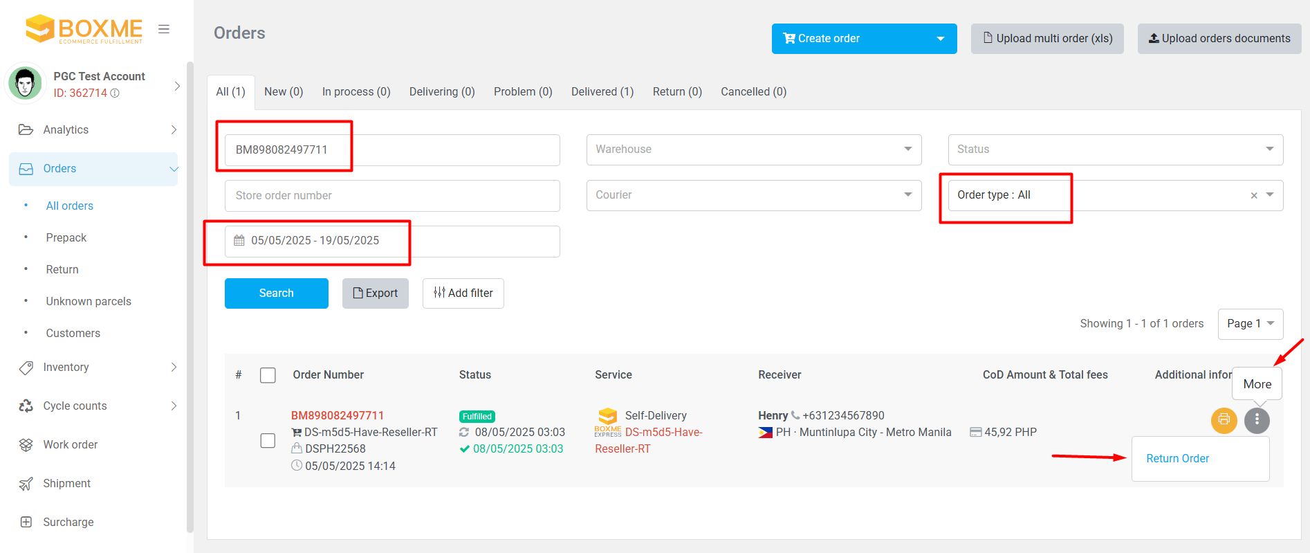 After the system displays the Boxme origin tracking order code, click on the right bottom corner of the order, select More, and click Return Order.