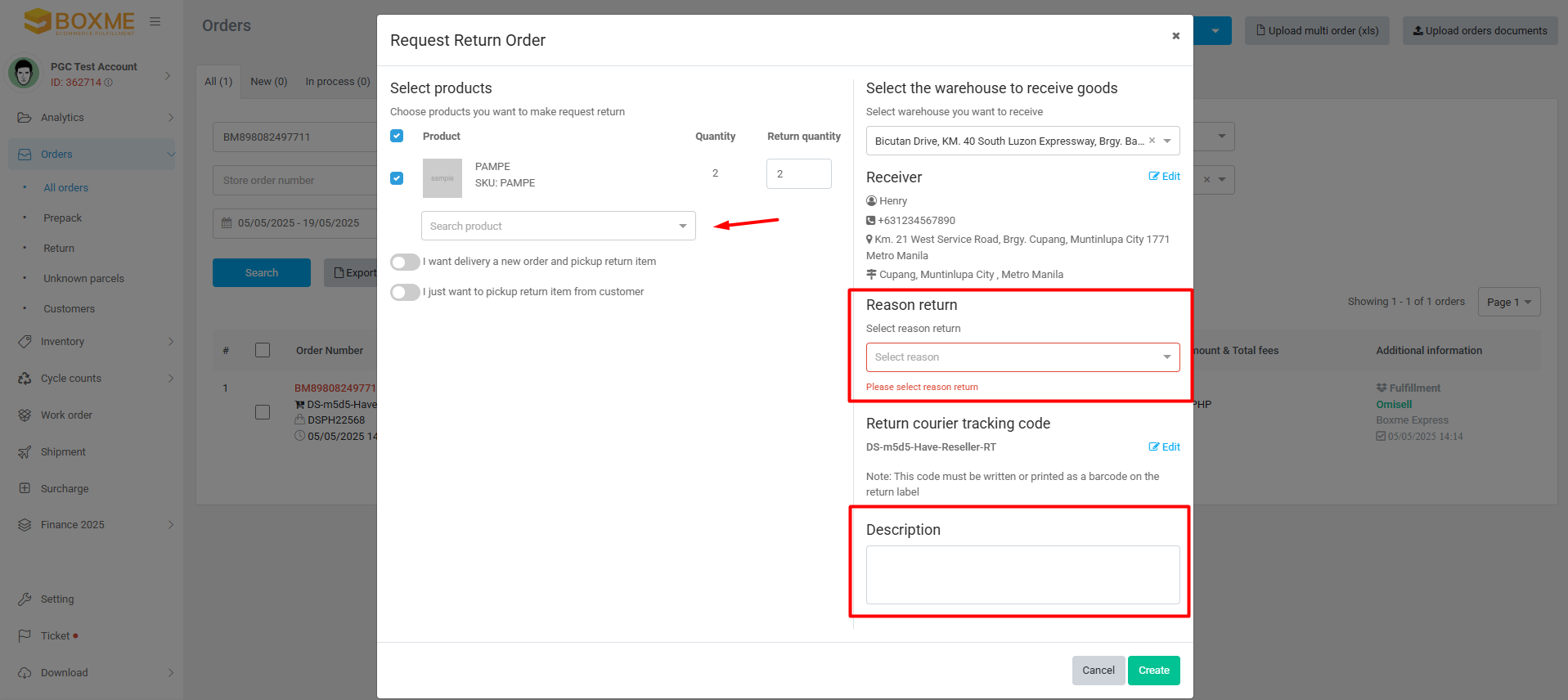 The return order creation feature on Boxme to serve customers when there is a need to create additional return codes for the warehouse to process any unknown return orders.