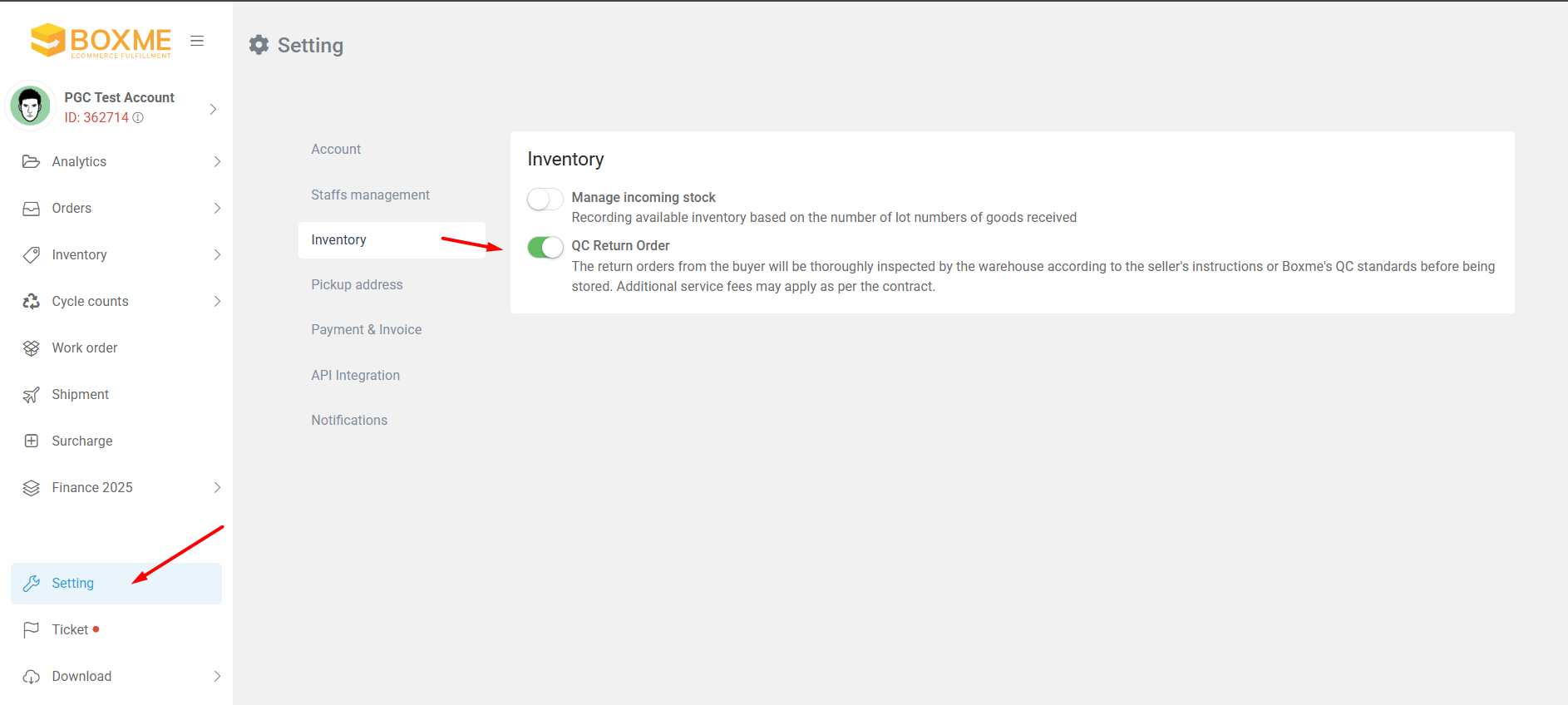 Return orders can send quality inspection requests through the system or default QC settings for all return orders.