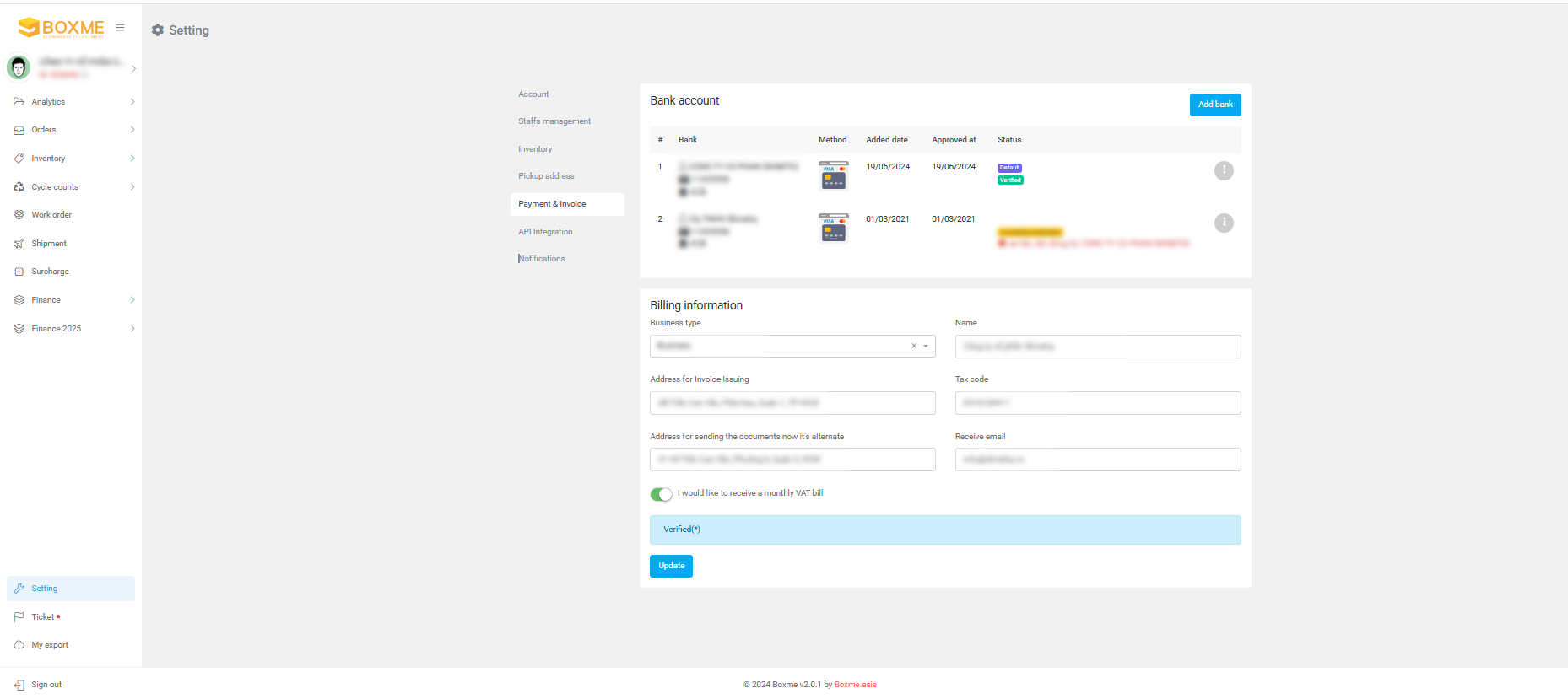 In case of an unsuccessful payment transfer, Boxme will notify the customer of the reason and process the payment in the next scheduled reconciliation cycle.