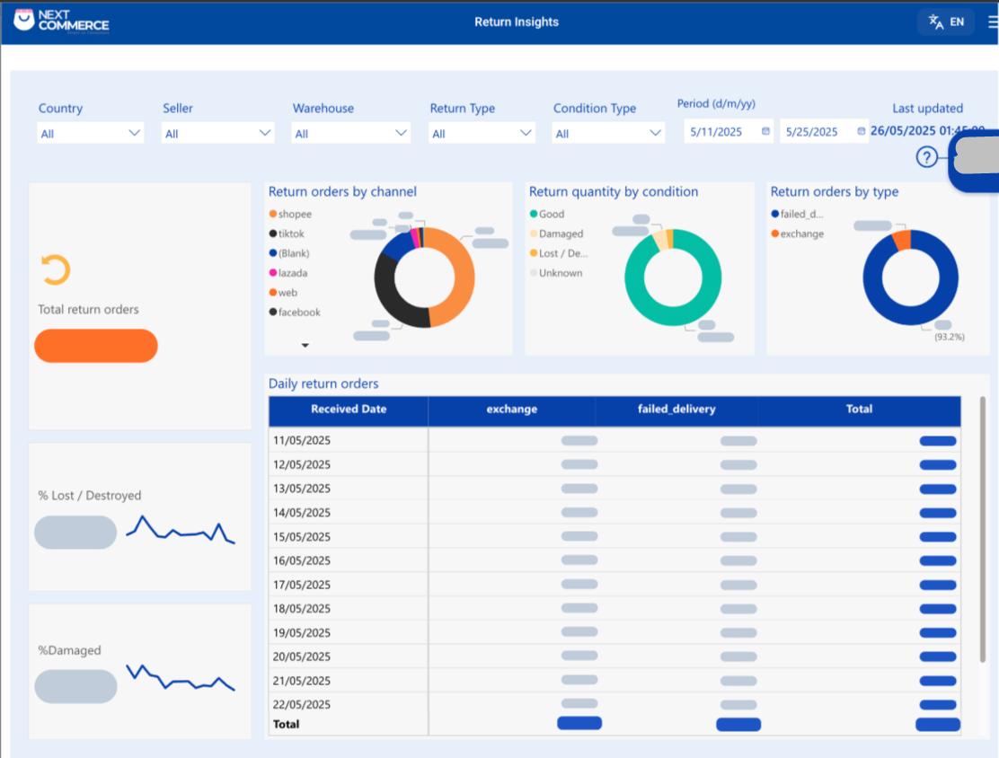 Objectives : Provide an overview report of return orders due to failure/return reason and return rate of damaged goods to identify causes, abnormal rates, and affected costs. From there, propose actions to minimize damage, optimize costs, and increase the experience of the buyer.